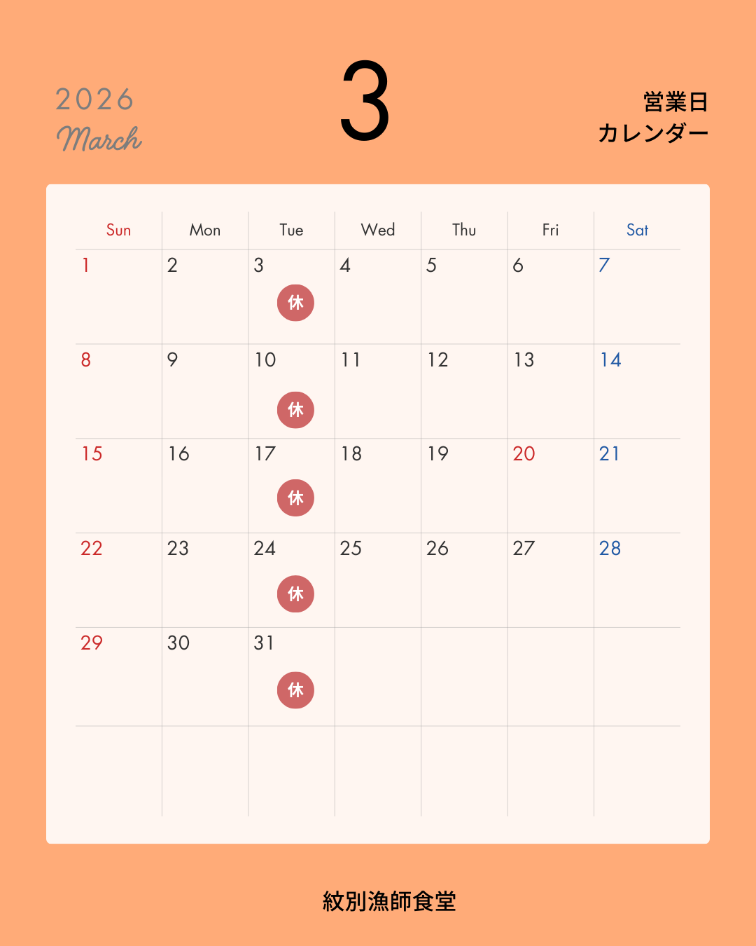 さて、弊社直営店【紋別漁師食堂】の2月の営業カレンダーのお知らせです。
